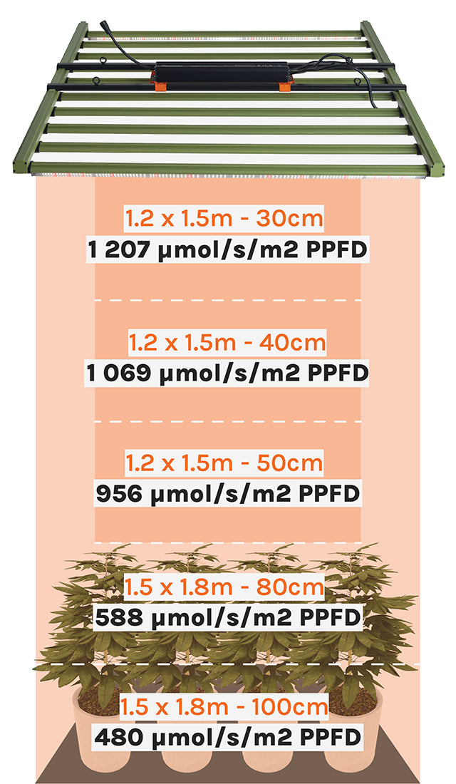 - Extremely high light output with fixture efficacy of up to 3.1 μmol/J, utilizing diodes with an efficacy of up to 4.70 μmol/J on the GL+ fixtures.